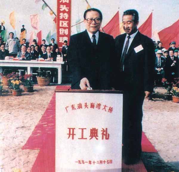 1991年12月17日,中華人民共和國中央軍事委員會主席江澤民為汕頭海灣大橋啟動開動電鈕。