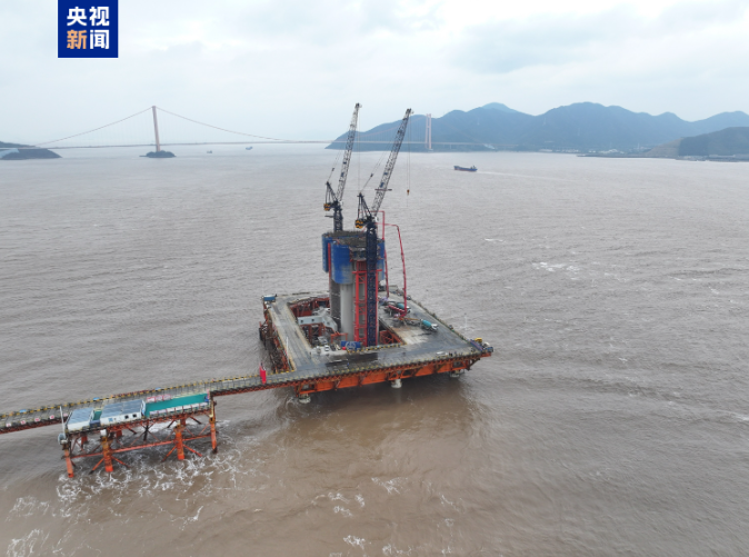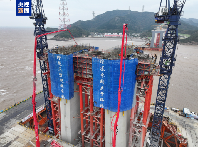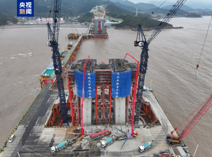 今天上午11時,在西堠門水道上方,隨著3700方混凝土全部澆筑完成,歷經持續40個小時的奮戰,甬舟鐵路西堠門公鐵兩用跨海橋首個主塔下橫梁澆筑完成,創下了跨海大橋墩身施工中一次性澆筑最大方量的世界紀錄。