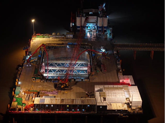 杭州灣跨海鐵路橋是通甬高鐵的控制性工程,全長29.2公里,采用時(shí)速350公里的雙線無砟軌道設(shè)計(jì),是超大的高速鐵路橋梁集群工程,自2022年11月開工,已經(jīng)過2年連續(xù)不間斷施工,計(jì)劃2027年年底具備通車條件。此次完成澆筑的北航道橋9號主塔墩承臺,面積相當(dāng)于5個(gè)籃球場,設(shè)計(jì)使用混凝土方量近14000立方米。