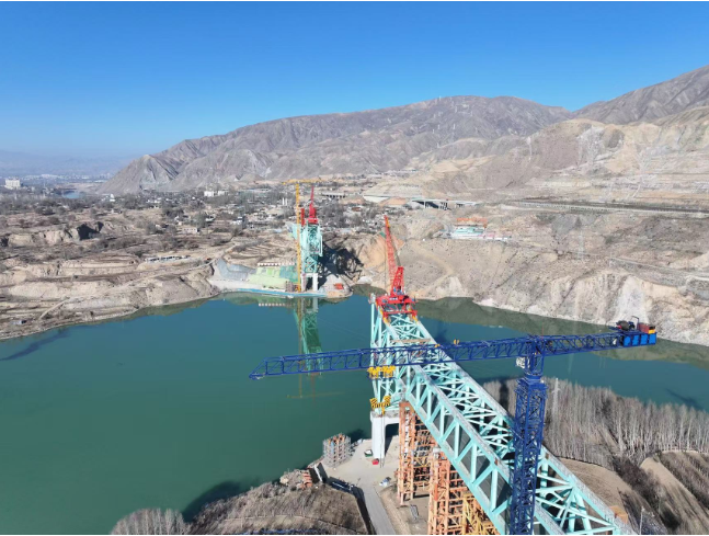 進入冬季,令人矚目的青海省尖扎黃河特大橋仍在施工。遠遠望去,兩岸在建的青綠色橋體節間正一節節向河中央延伸,猶如一條巨龍給人以強烈的視覺沖擊。