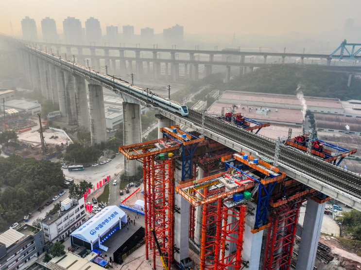 圖為成渝中線重慶樞紐施工1標(biāo)井口雙線特大橋下穿滬蓉線完成“托梁換柱”后,列車飛馳而過。(中鐵大橋局供圖)